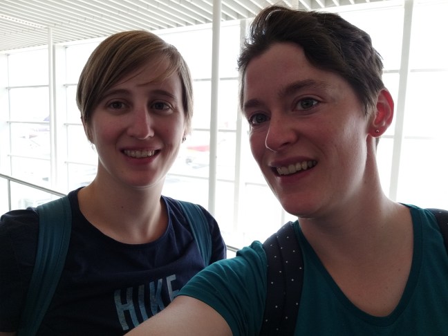 Bien à l’aéroport, sur le point d’embarquer pour l’énorme aventure qui nous attend!